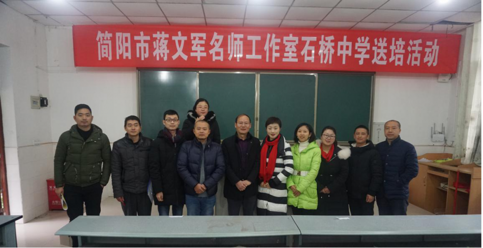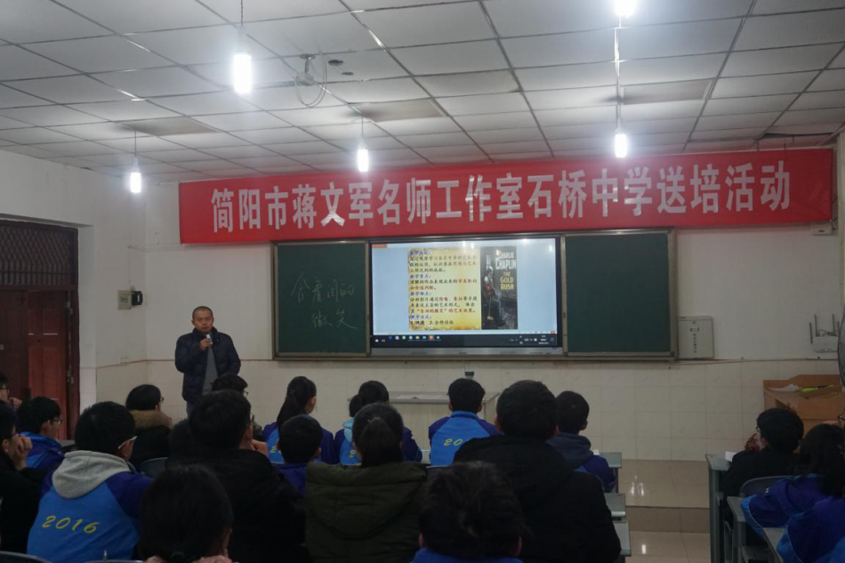蔼蔼冬雾,挡不住学生们求知的热情;瑟瑟冬风,拂不去学习者思考的心绪。12月21日上午,简阳市蒋文军名师工作室送培活动在石桥中学开展,活动得到了石桥中学校领导马元贵、胡林、谢建国的高度重视。名师工作室领衔人、简阳市教师进修学校副校长蒋文军带领其工作室全体成员及石桥中学部分语文教师参加本次活动。此次送陪活动由石桥中学周天成老师给我们带来了精彩的语文课《<淘金记>含泪的微笑》。