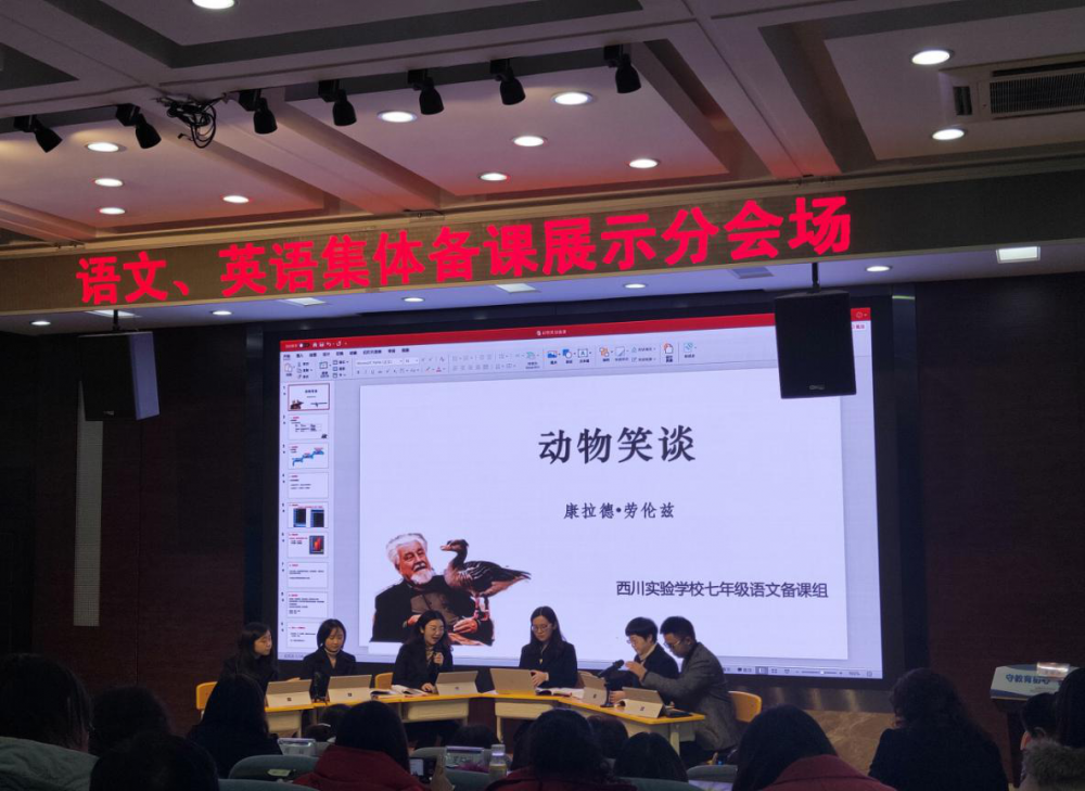 下午,学员来到学术一厅分会场观摩了语文、英语集体备课展示活动。成都市石室联合中学的英语集体备课组现场展示的是人教版《Go for it》的教学《Unit7 Hou much are these socks?》。成都市西川实验学校七年级语文备课组现场展示的是《动物笑谈》。两支优秀备课组团队围绕着教材解读、学情分析、教学目标和教学设计等内容展开热烈探讨,每一位教师对教材的独立解读与思考让大家收获颇丰。