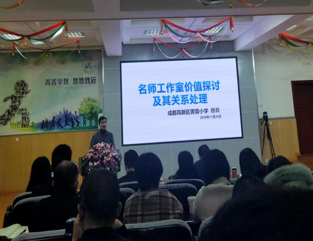 菁蓉小学市学科带头人、高新工匠缪兵副校长以《名师工作室价值探讨与关系处理》为题做分享,他聚焦数学学科育人新模式,他认为要汇集工作室成员学校资源实现价值共享;建立课题,以课题引领成员和学校的学科专业发展;同时要把工作室常态研究和学校校本研修统整、集成,产生双向激发的力量。