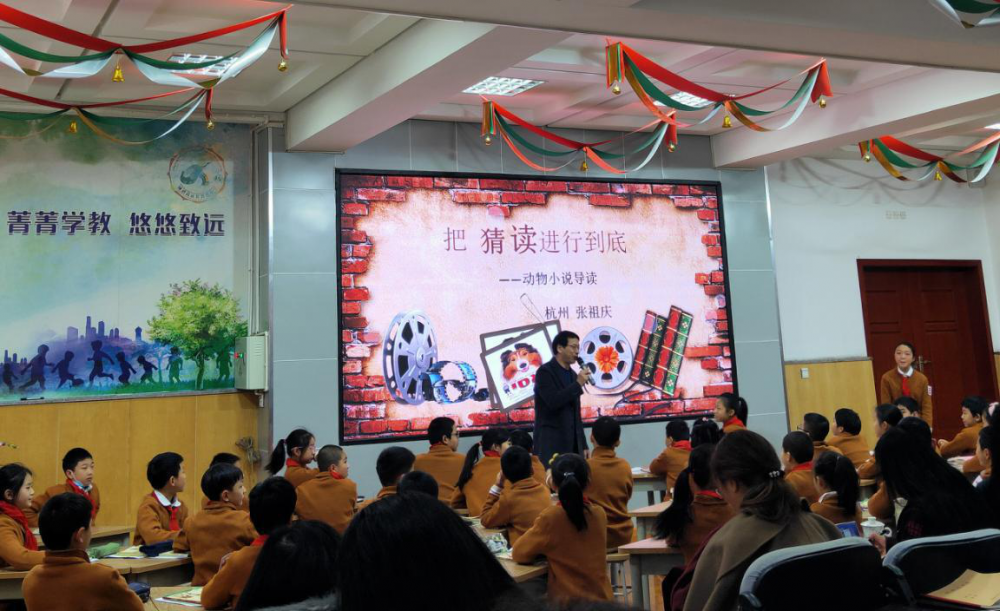 上午由菁蓉小学青年教师何小娟执教《班级聊书会》、陈曦市级名师工作室成员、四川省教科院附属实验小学陈瑶老师执教《孤岛野犬》导读课,给我们带来关于阅读的别样课堂。最期待的是张祖庆老师带来的示范课《把猜读进行到底——动物小说导读》,课上,张老师精湛的教学技艺,引领孩子们在充满创意的猜测教学环境中,孩子们全身心浸入课堂,思维灵动,表达出彩,师生、生生间的碰撞精彩无比,是一节有语感训练、有思维品质培养、有思想内涵的导读课。让我们深深体验到张老师导读课的特点:导出兴趣、导出创意、导出思维、导出策略。这一节导读示范课为一线语文老师打开了视野与思维,老师们对导读课有了更立体、深刻的收获和启发。三节课结束后,两位青年教师说课,张祖庆老师作学术点评和引领。