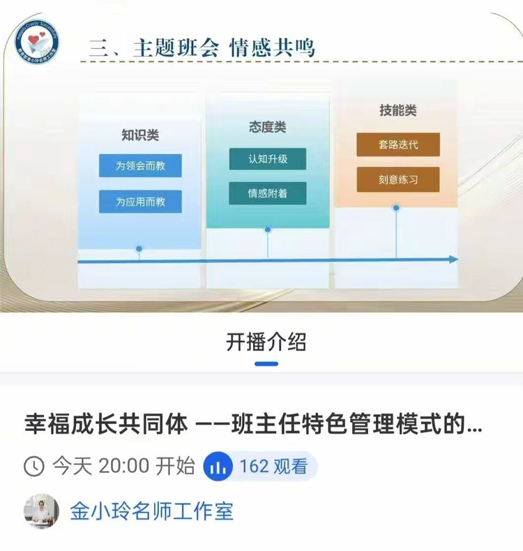 为深入探索班主任特色管理路径,践行 “以仁立教、以爱育人” 的教育理念,教育部金小玲名师工作室于2026年 1 月 17 日 20:00-21:00,在国家中小学智慧教育平台开展专题直播研修活动。工作室核心成员、正高级教师王朝老师以《幸福成长共同体 班主任特色管理模式的实践探索》为题,结合 31 年班主任工作经验,从六大维度倾囊相授管理智慧,吸引众多教育同仁云端相聚、共研共进。本次研修活动既是工作室深耕班主任专业成长的重要实践,更是对 “幸福教育” 理念的生动诠释与落地探索。