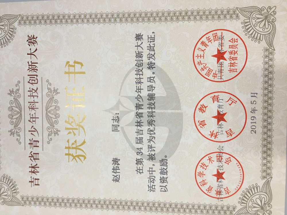赵伟涛老师被评为吉林省青少年创新大赛优秀辅导员(2019年5月)